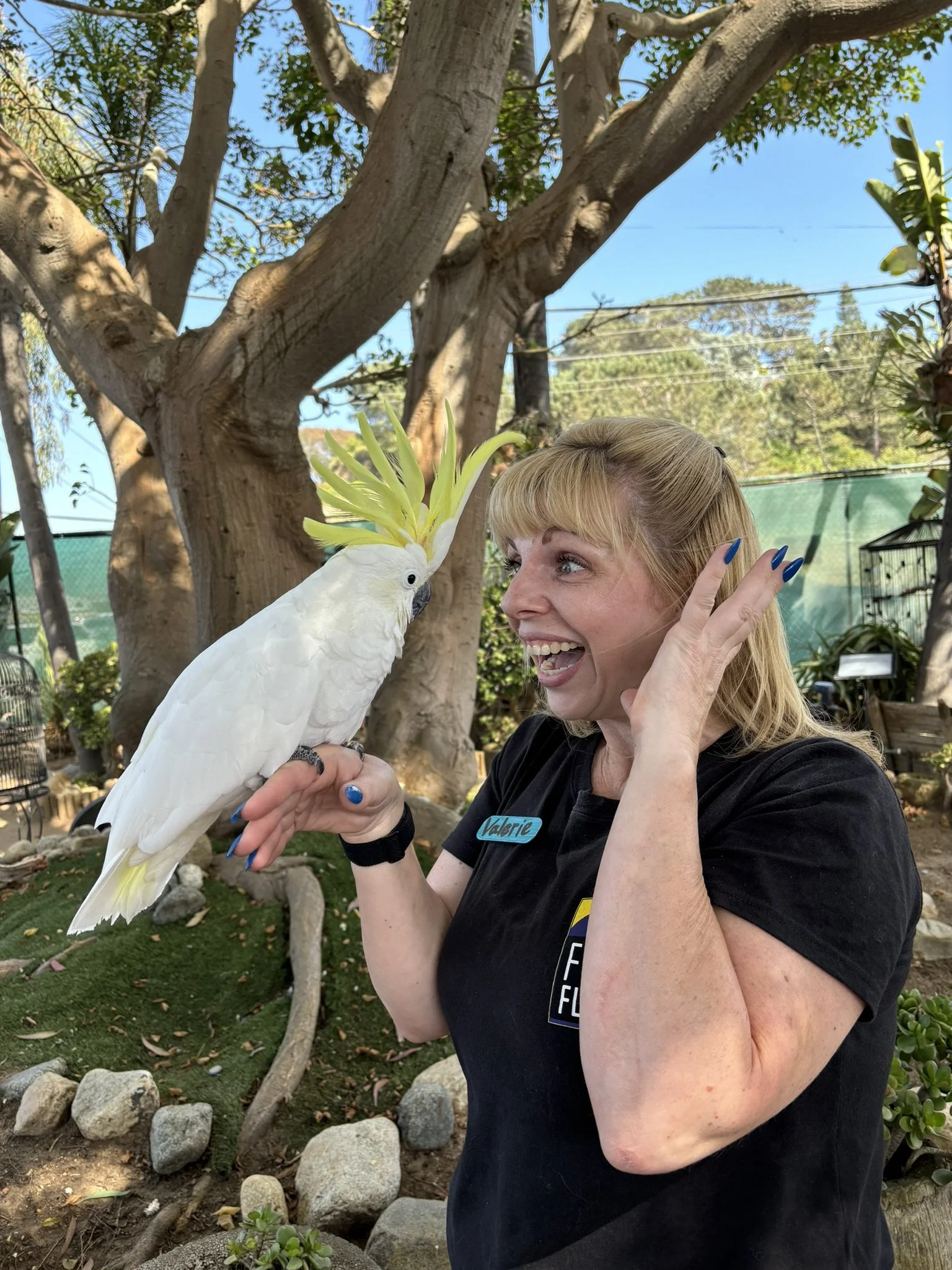 Resident cockatoo “Zowie” recently celebrate his one year “gotcha-day” (adoption) anniversary with his new mom, volunteer Valerie. We’re delighted to share that he still visits regularly for his pedicures and to spend time visiting his favorite staff members!