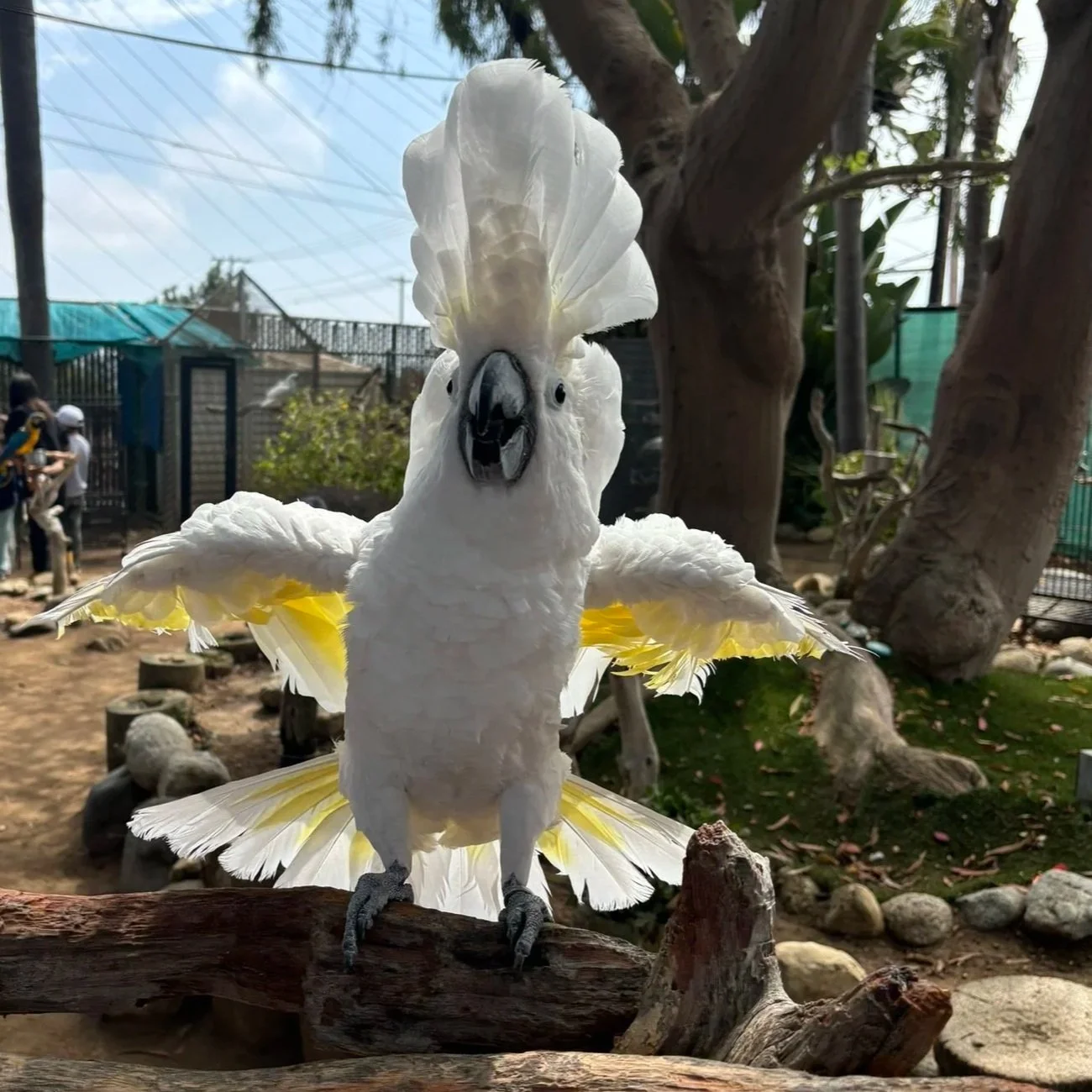 After a number of years as a loyal boarding client, Missy officially joined Free Flight’s full-time resident flock in April 2026! She’s a very sweet girl who knows her own mind, and is easily distinguished from the other umbrella cockatoos because of her unique “smile!” Missy sees a vet regularly to help maintain and correct her slight scissor beak, and she appreciates having her produce chopped extra small so it’s easier to eat.